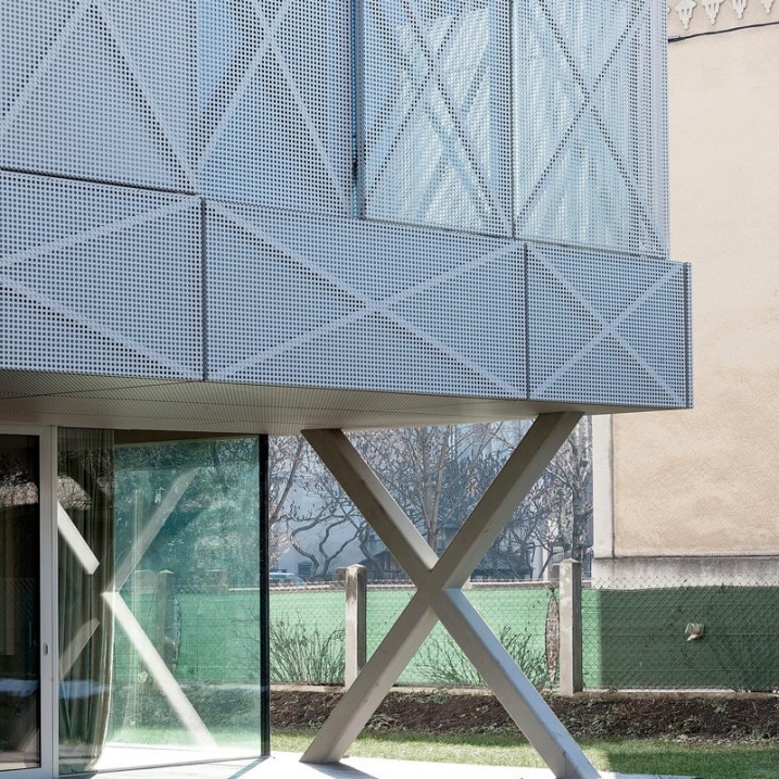 La particularité de cette maison résulte dans l’utilisation du métal pour la façade.Utiliser un matériau avec des trous sur les deux côtés vise à faire une interprétation abstraite de la texture des villas classiques dans la banlieue historique.