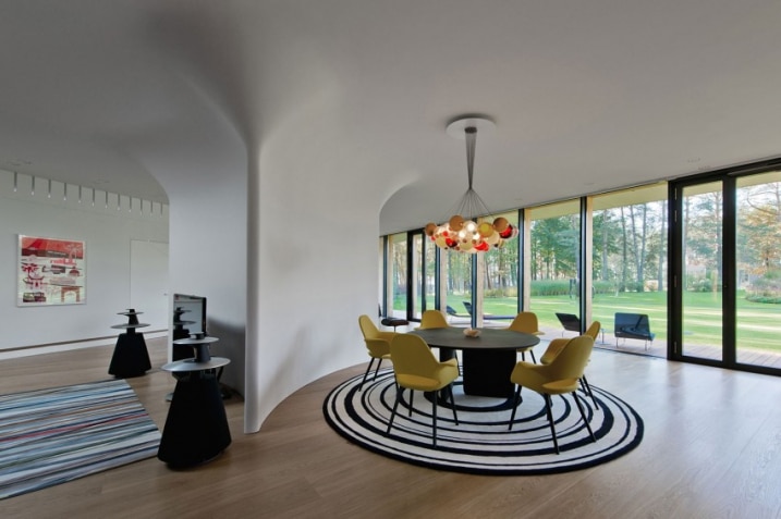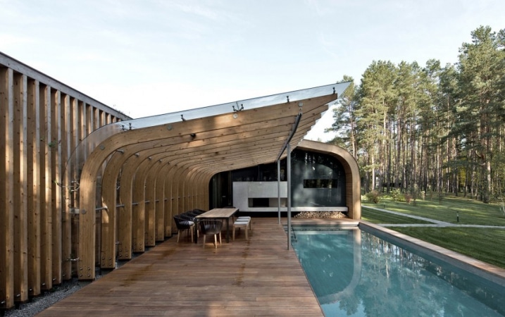 La particularité de la maison résulte dans la construction de sa toiture avec sa forme arrondie, et de ses formes fluides bordées par des pergolas en bois.