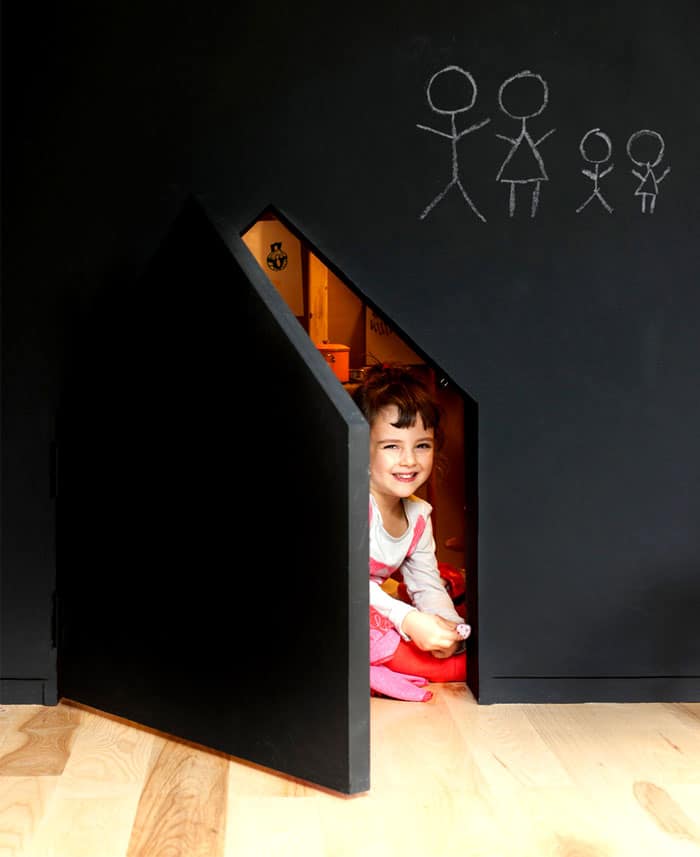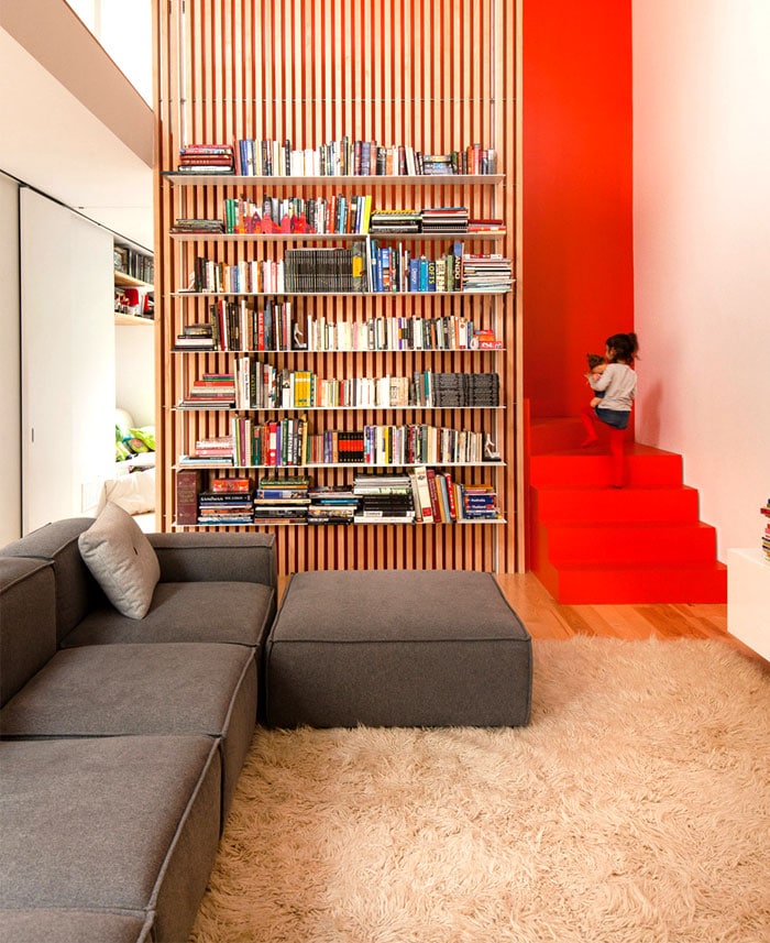 Le principal point focal de ces pièces est la magnifique étagère en bois qui contraste avec l’escalier rouge, leur combinaison apporte à la pièce son caractère unique.