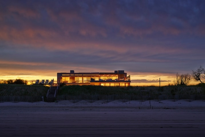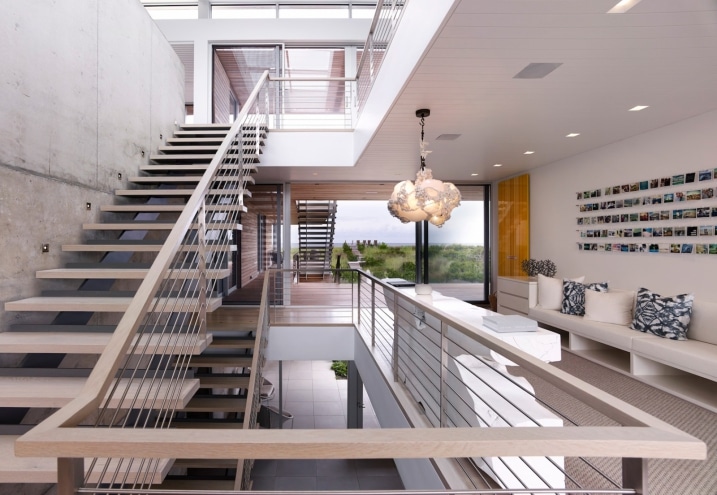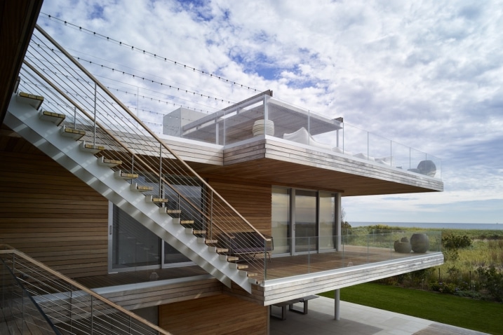 Cette maison située à Bridgehampton dans l’état de New York est un grand projet résidentiel construit pour communiquer avec le bord de mer à travers une série de ponts en porte à faux et de terrasses sur le toit conçu par le cabinet d’architecture Stelle Lomont Rouhani.Un espace ouvert est disponible à chaque étage de la maison, il y a trois zones distinctes à chaque étage avec une décoration et un aménagement extérieur principalement recouvert de bois pour bénéficier d’une ambiance naturelle et confortable.