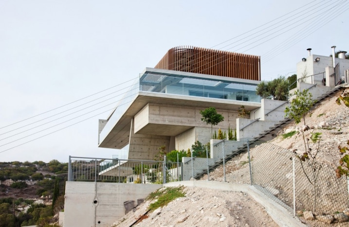 L’entrée sur le niveau supérieur de la maison avec un garage sur le toit. Tous ces détails s’adaptent à l’emplacement inhabituel de l’environnement.