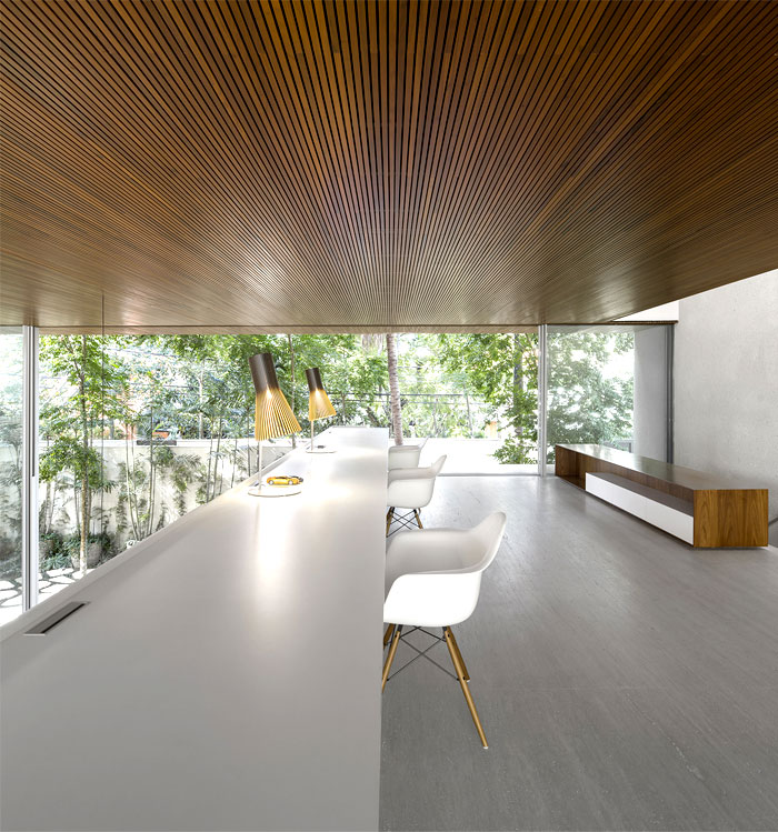 Les longues lames de bois qui recouvrent le plafond et la façade de cette maison contemporaine située à Sao Paulo au Brésil apportent un aspect unique et du caractère à la propriété. En plus de la sensation chaleureuse et intime que ce revêtement en bois apporte dans la maison, le coté atypique au niveau de l’aménagement est assez curieux.