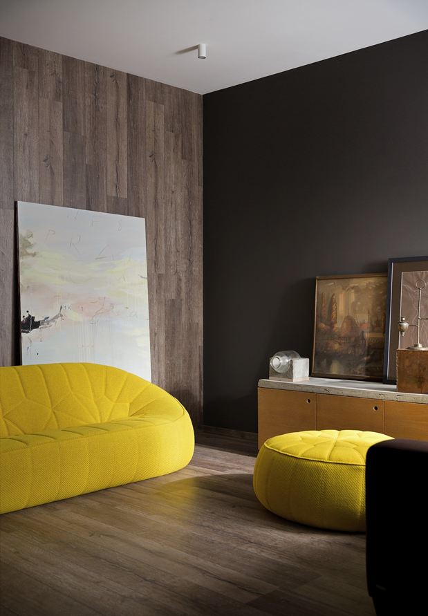 Cette association crée un sentiment d’intimité, l’espace reste connecté au reste du plan d’étage ouvert, les tons sombres et la sélection des textures contribuent également à cet effet.
