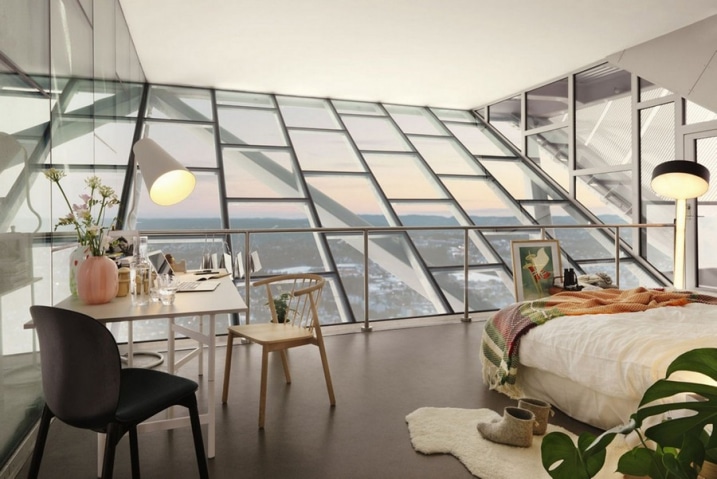 Dans la chambre, le lit est positionné d’une telle manière pour qu’il capte les vues imprenables sur les environs.