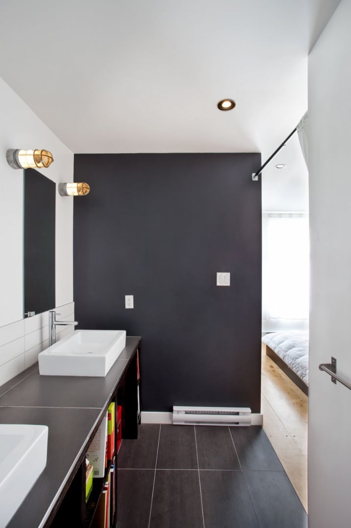 Salle de bain avec des murs gris et blanc