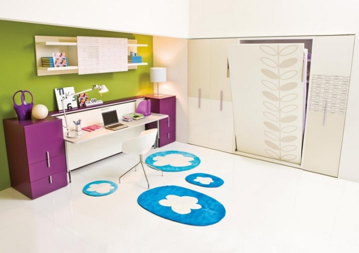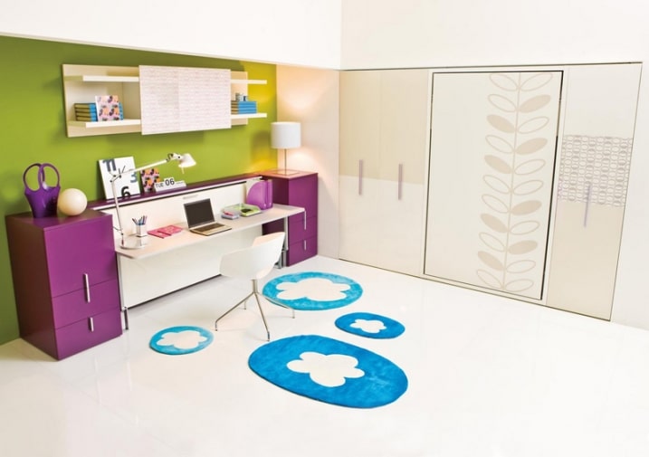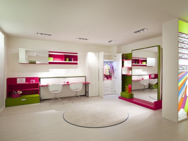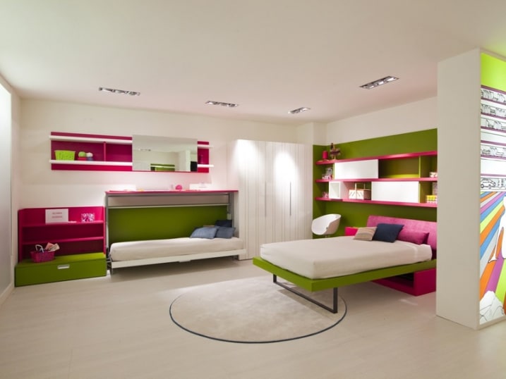 Chambre enfant verte et rose lit replie