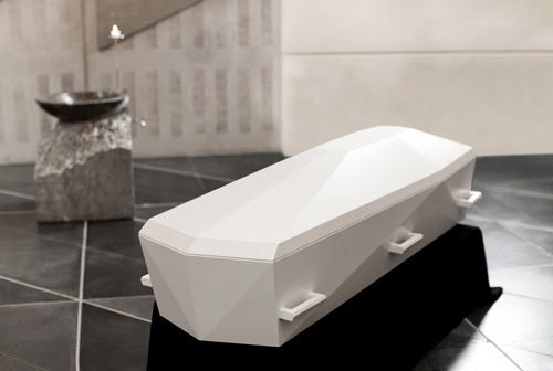 Les cercueils sont fabriqués en contreplaqué de bouleau nordiques et fini avec de la laque et de peinture noire ou blanche mat à base d’eau. Les intérieurs de cercueils sont recouverts avec un coton à motifs organiques.