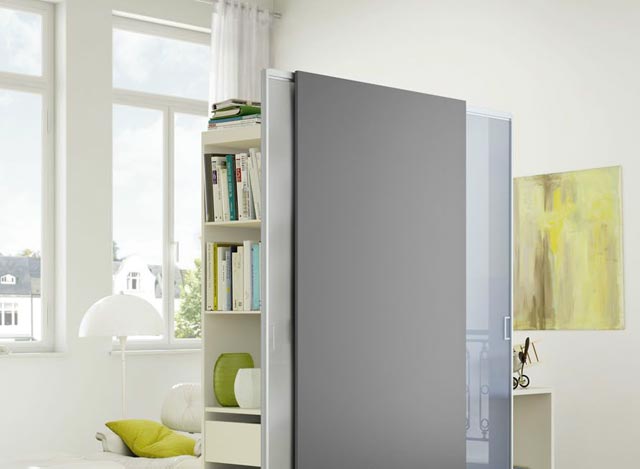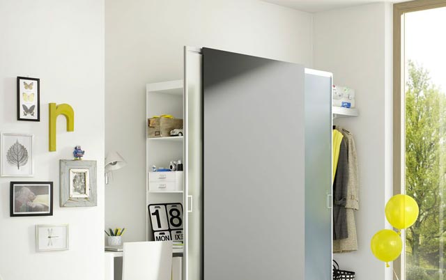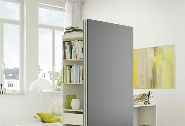 Il s’agit d’une cloison escamotable en partie et d’un système d’étagère qui permet de ranger vos affaires tout en les camouflant de façon clean et intelligente. Vous pouvez ajouter des portants et ce système de rangement Raumplus se transforme en dressing. Positionnez le au centre d’une pièce et il se transforme en cloison amovible…