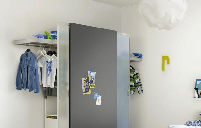 Ses portes coulissantes peuvent se refermer complètement derrière le panneau intégré à l’étagère de rangement…
