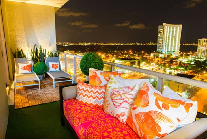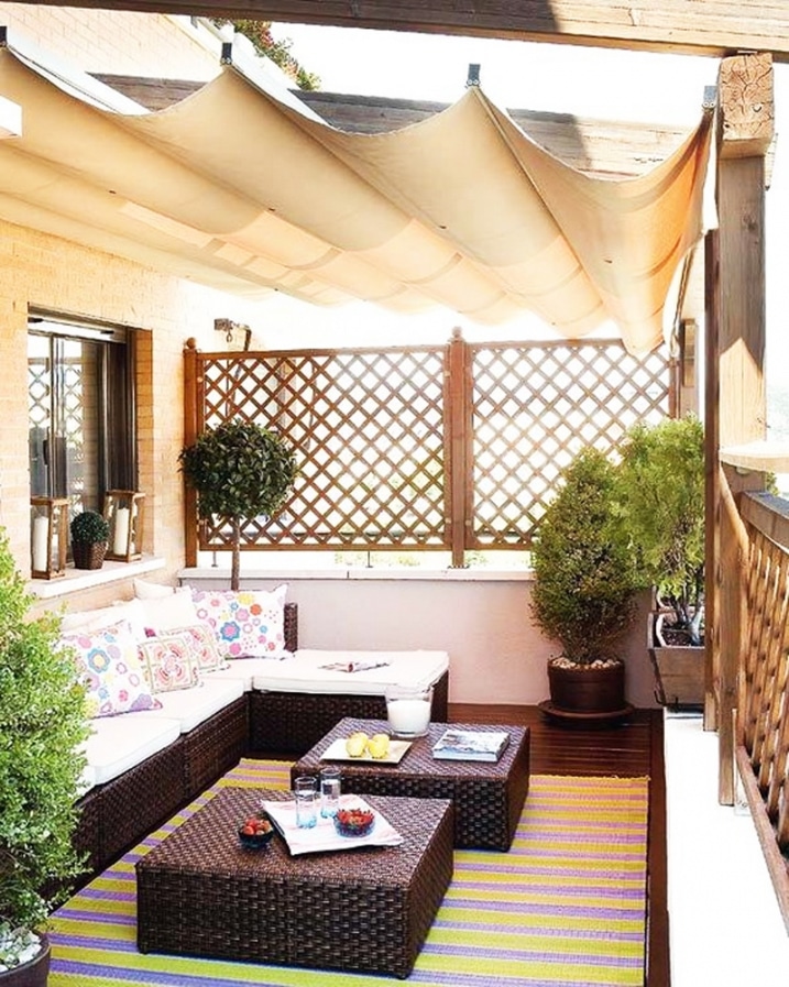 Décoration balcon avec canapé et coussins