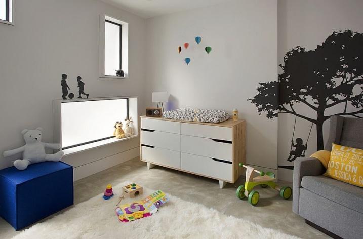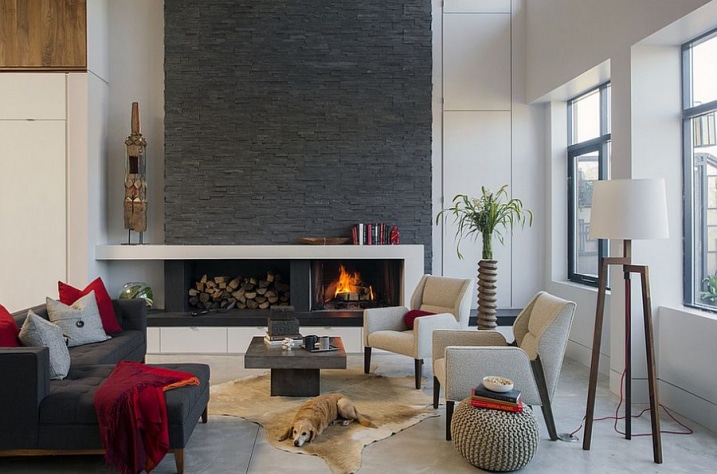 Le salon est composé d’une cheminée, coté décoration, des tons neutres sont utilisés avec une quantité généreuse de gris, tandis que les oreillers et les accessoires ajoutent des touches de couleurs vives.