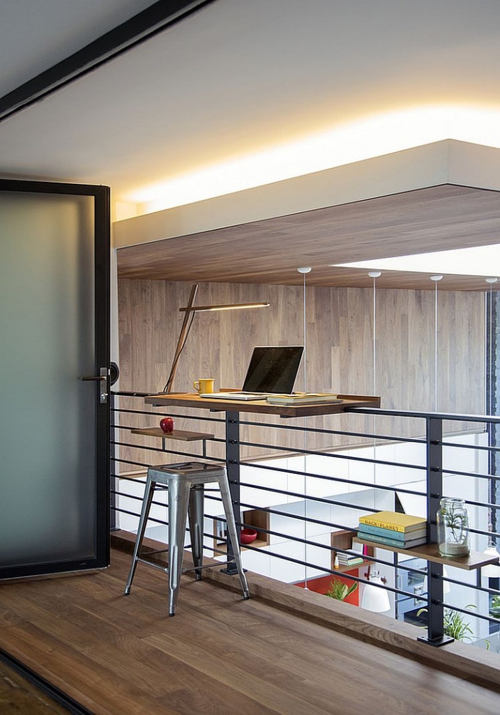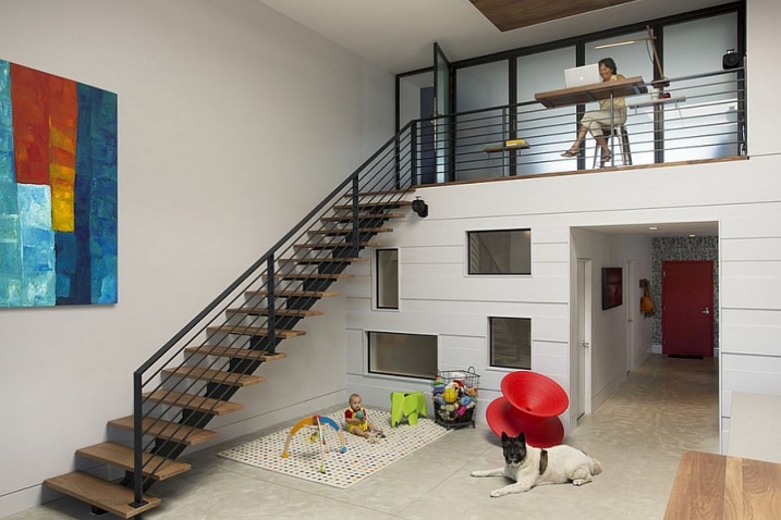 Le noyer est largement utilisé dans toute la maison, avec notamment cet escalier qui conduit au niveau supérieur qui comporte le bureau, la suite parentale et sur un petit coin de travail qui permet aux adultes de la famille de garder un œil sur le niveau inférieur.