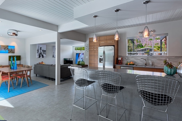 Dans cet exemple, les cactus positionnés au sol contrastent avec les palmiers situés à proximité, ce qui complète parfaitement le style contemporain et élégant de cette résidence.